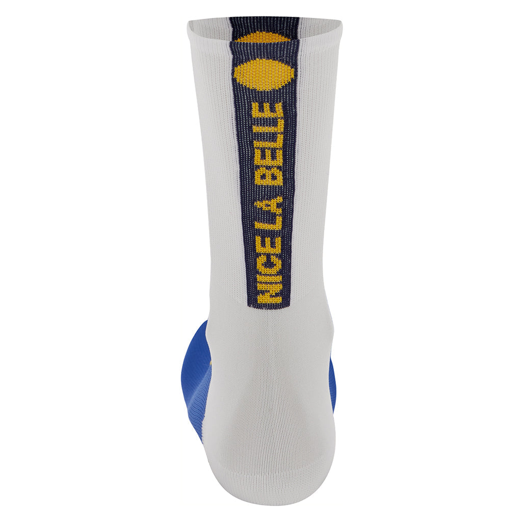 High profile cycling socks, created using a design dedicated to beautiful Nice, the finish of the legendary Paris-Nice stage race on the Côte d’Azur. The design plays with imagery and colours inspired by the Promenade des Anglais, the sea, beach and blue skies, with a subtle reference to the artist Henri Matisse, who called the city he called his home for over three decades.
